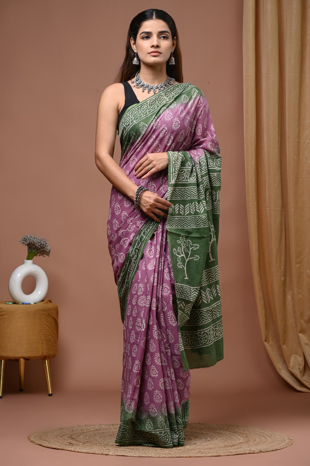 Hand Block Printed Mulmul Cotton Saree in Purple and Green with Traditional Motifs