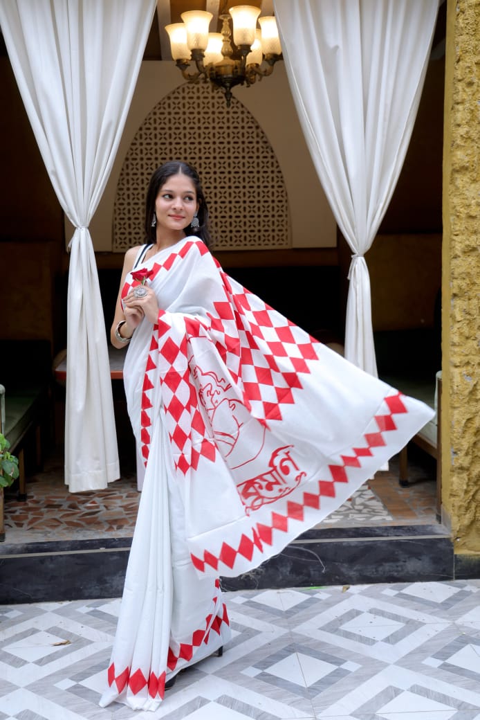 Hand Block Printed Mulmul Cotton Saree with Red Diamond Patterns