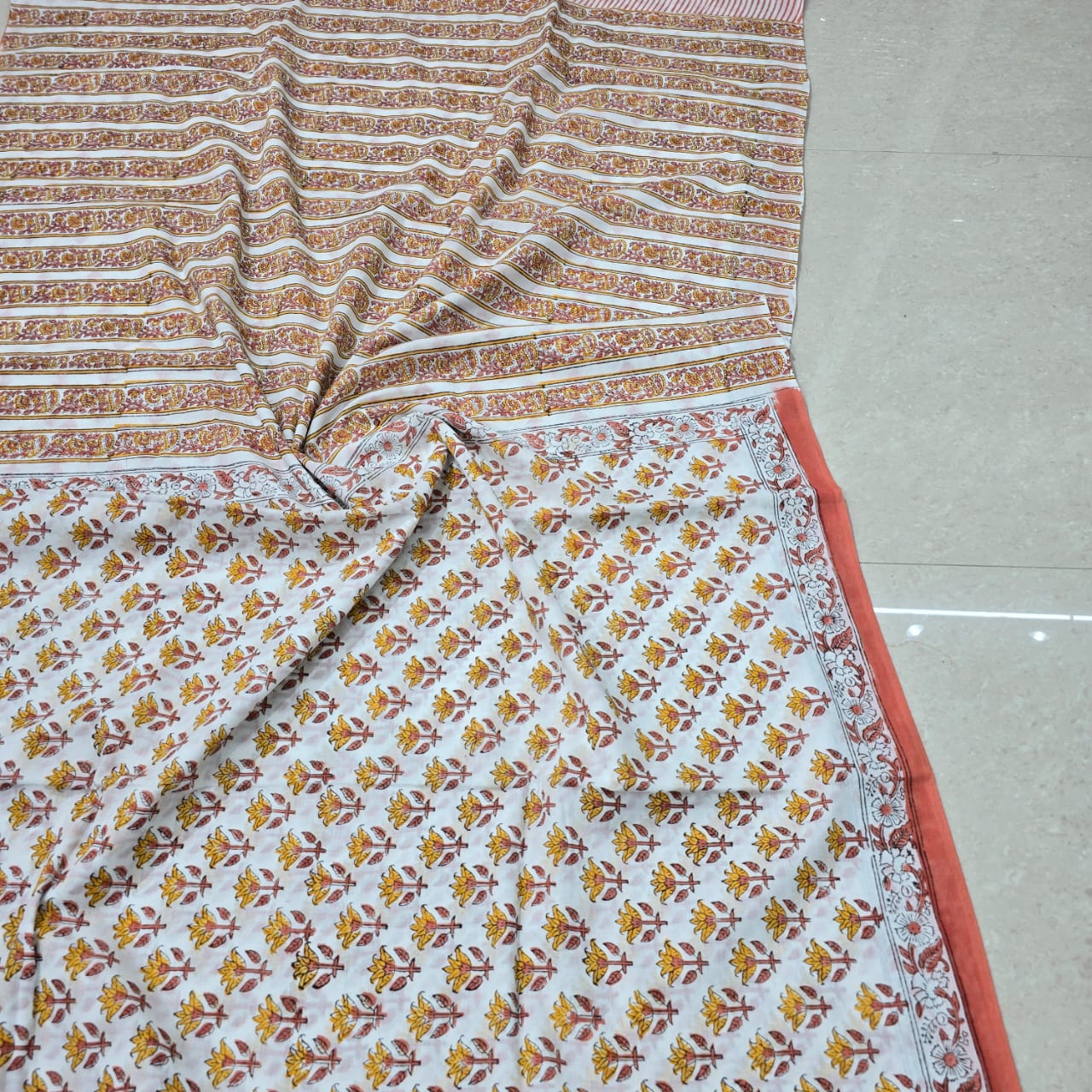 Experience the timeless elegance of hand block printing with this artisanal saree set. Crafted from premium mulmul cotton, this saree features a mustard base adorned with intricate floral motifs in shades of orange and brown. The exquisite design extends to the border, showcasing a detailed floral pattern in reddish-orange and white. The set includes a matching printed blouse piece for a complete ethnic look. Embrace comfort and style with this handcrafted masterpiece.