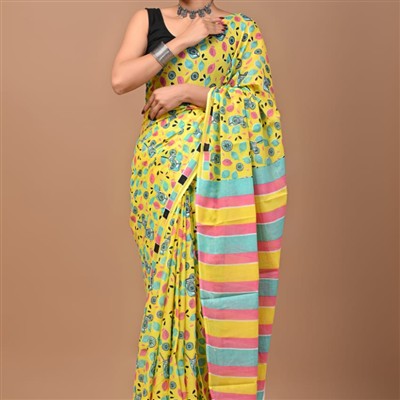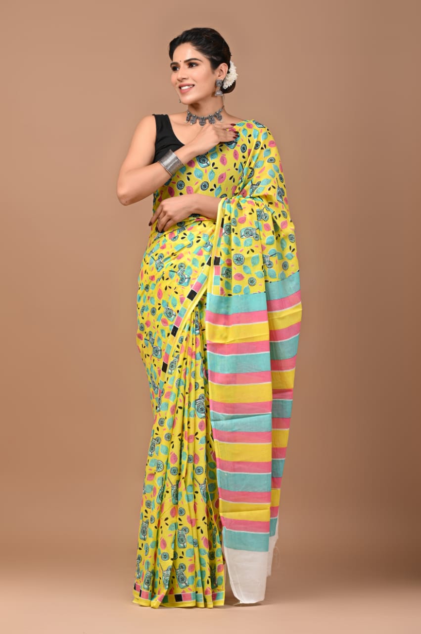 Elevate your ethnic wardrobe with this hand block printed Mustard Mulmul Cotton Saree from Blockart. Crafted with care, the lightweight fabric offers comfort for all-day wear. The vibrant yellow base adorned with playful motifs exudes traditional charm. The pastel stripe pallu adds a contemporary flair, making it perfect for festive occasions or casual outings.