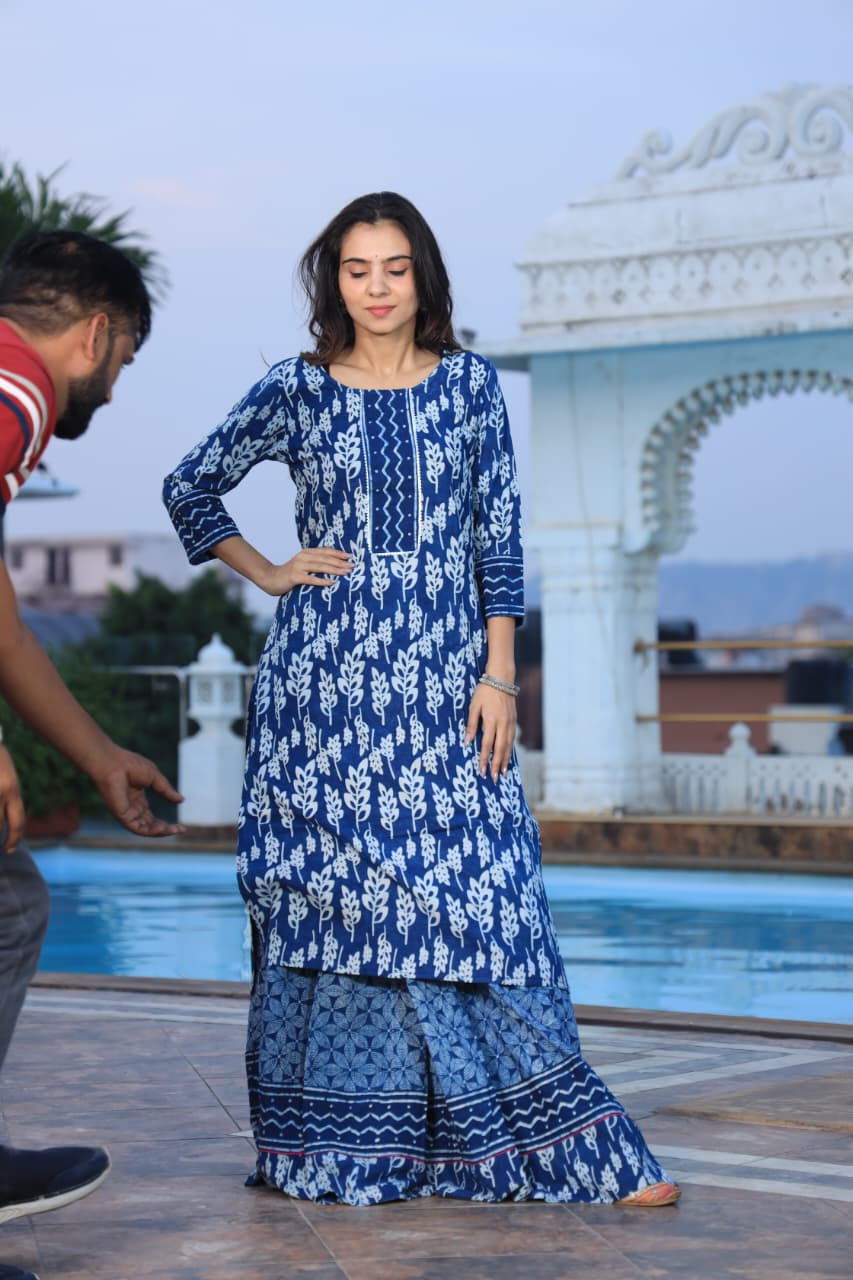 Hand Block Printed Navy Blue Cotton Kurta and Palazzo Set