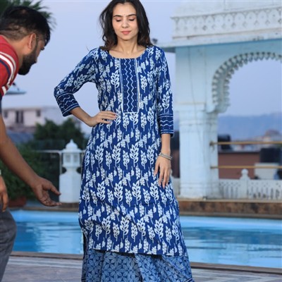 Elevate your ethnic wardrobe with this exquisite hand block printed kurta and palazzo set from Blockart. Crafted from premium cotton, this set features a beautifully detailed navy blue kurta with a round neckline and three-quarter sleeves. Paired with matching palazzo pants in a wide-leg design, adorned with intricate patterns and a border at the hem. Experience the comfort and elegance of traditional Indian craftsmanship with this ensemble.