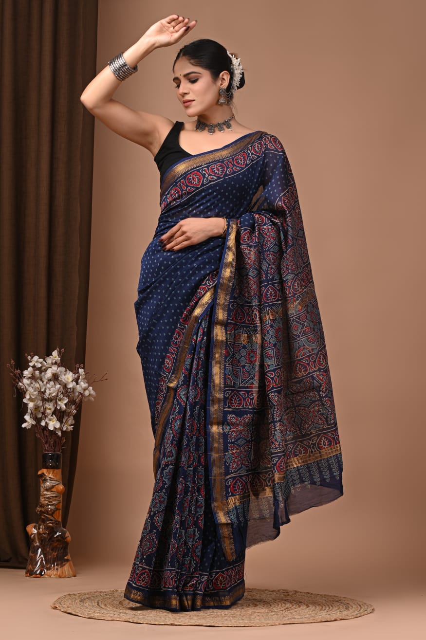 Elevate your ethnic wardrobe with this stunning navy blue Maheshwari silk saree. Handcrafted with intricate traditional motifs and gold accents, this saree exudes elegance and charm. Made from lightweight and sheer Maheshwari silk fabric, it offers a graceful drape and all-day comfort. The detailed border and elaborate pallu showcase the artistry of hand block printing, adding a touch of heritage to your ensemble.