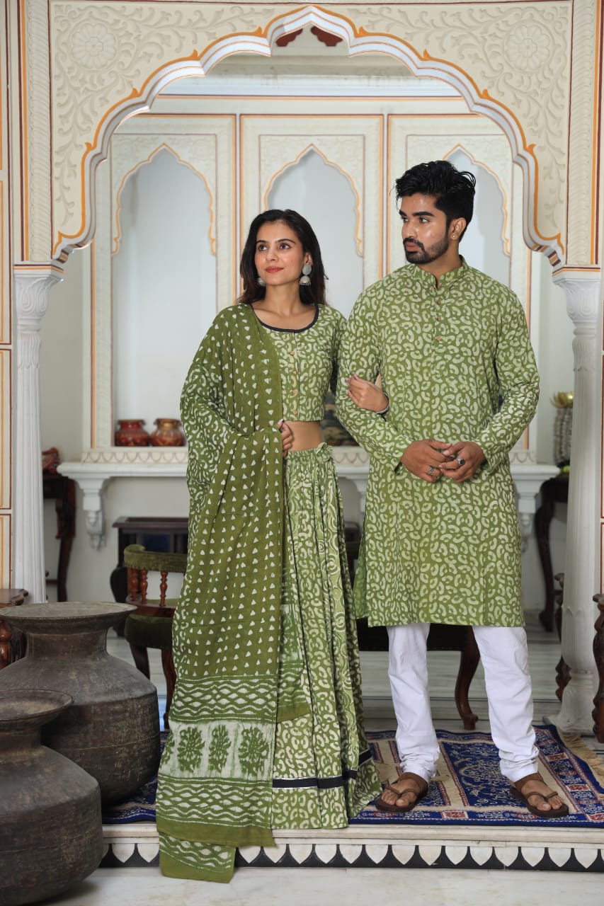 Hand Block Printed Olive Green Cotton Couple Ethnic Wear Set