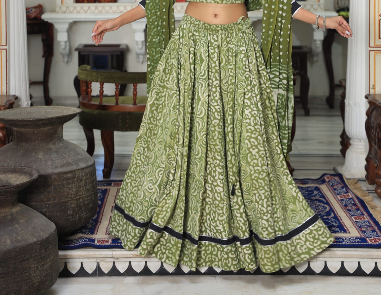 Experience the charm of traditional Indian crafts with our Hand Block Printed Olive Green Cotton Lehenga Skirt with Black Border Detail. This full-length skirt features a gathered, pleated design for added volume and flow, crafted from pure cotton (60x60 count) for lightweight comfort. The skirt showcases a traditional block print with abstract floral and paisley motifs, accented by a striking black border near the hem. The drawstring waist allows for easy adjustments, making it a versatile piece for casual or semi-formal occasions.
