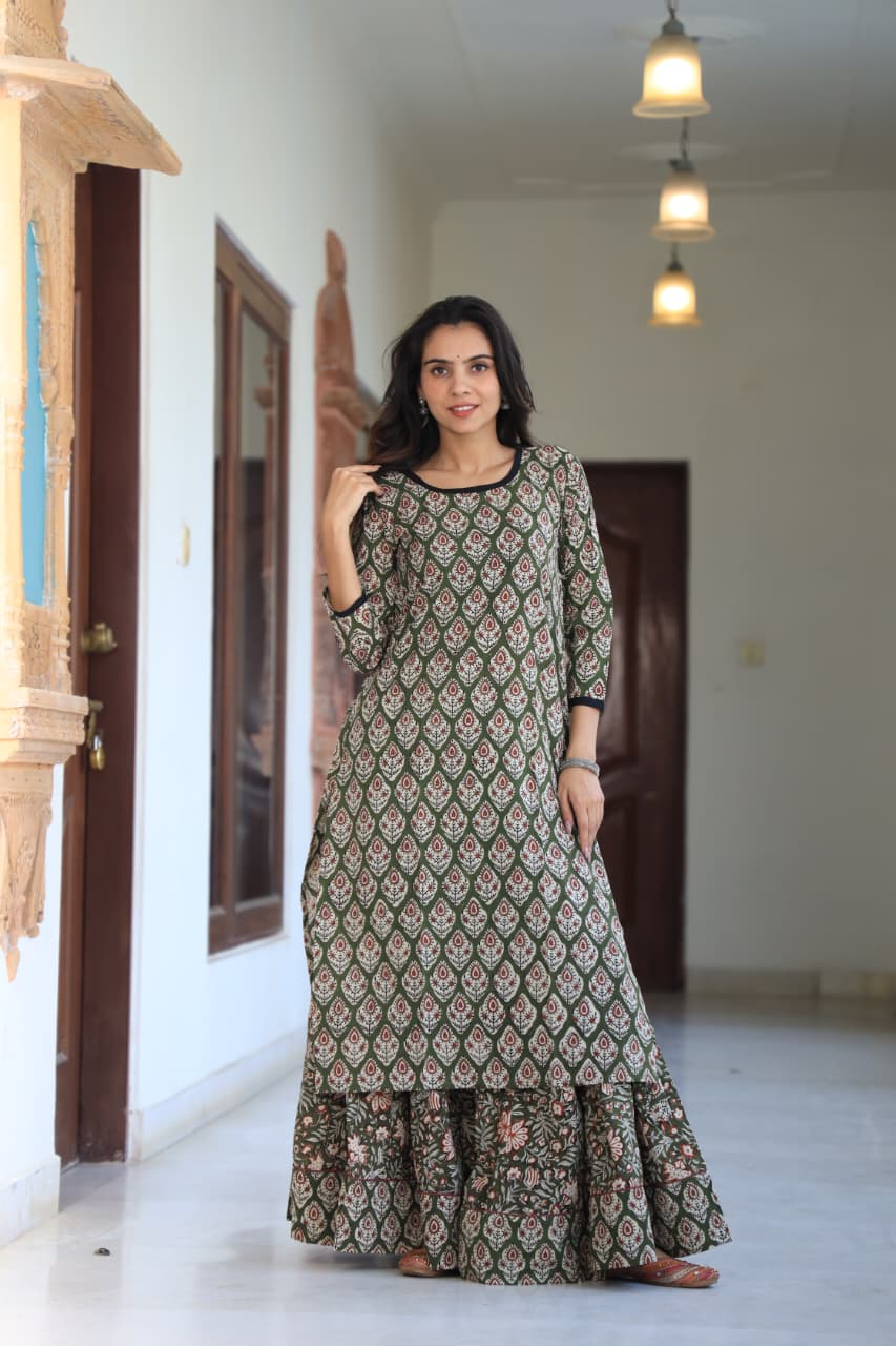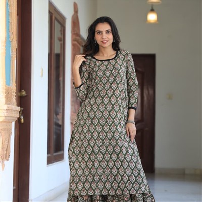 Elevate your ethnic wear collection with this exquisite olive green cotton long kurta and skirt set. Handcrafted using the ancient art of Bagru hand block printing, this ensemble features a round neckline with black piping, three-quarter sleeves with black edging, and intricate floral and paisley patterns. The matching skirt complements the kurta beautifully, adding a layered look perfect for casual or semi-formal occasions. Made from high-quality cotton, this set offers comfort, breathability, and a touch of Indian tradition.