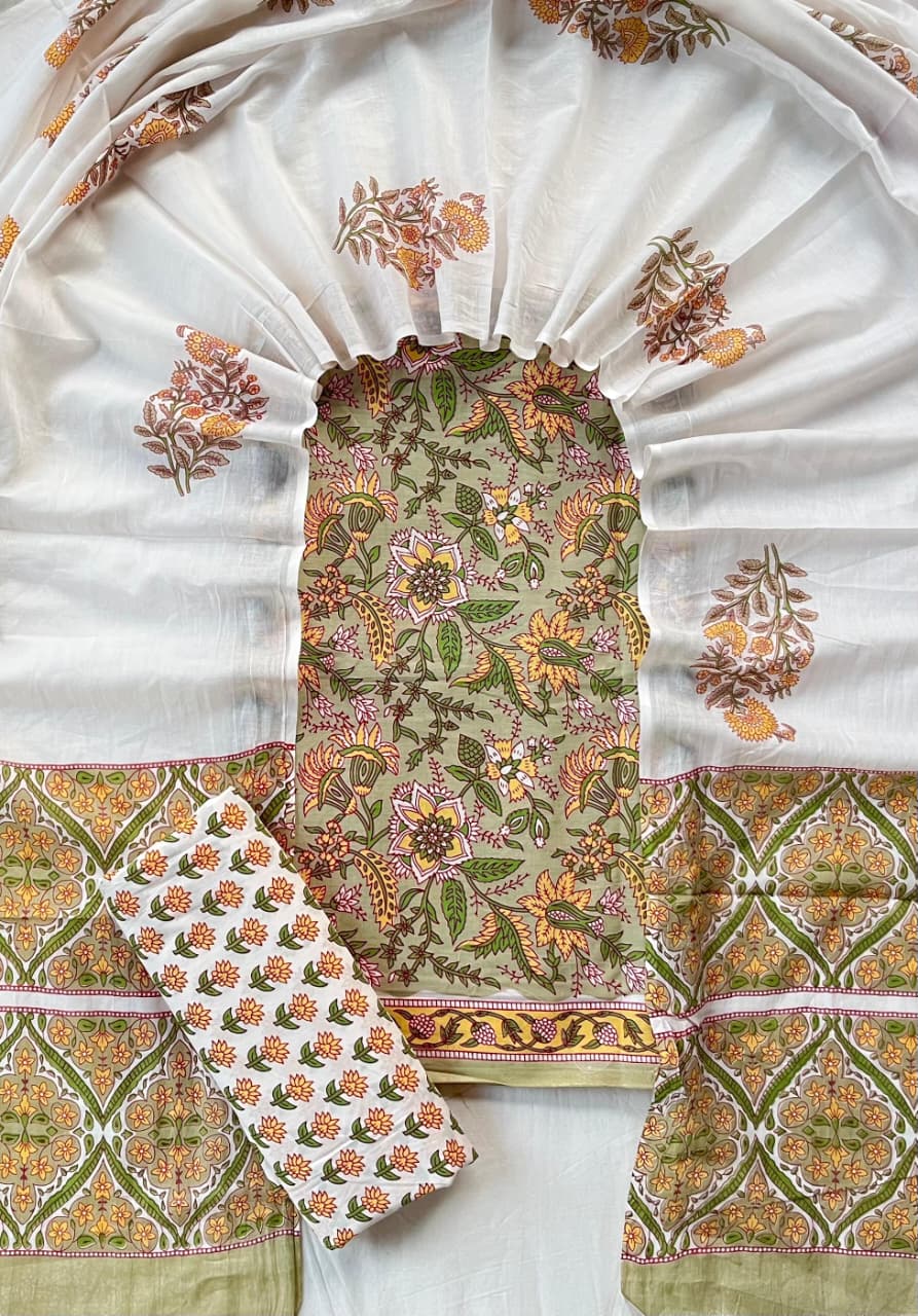 Hand Block Printed Olive Green Cotton Suit Set with Floral Border