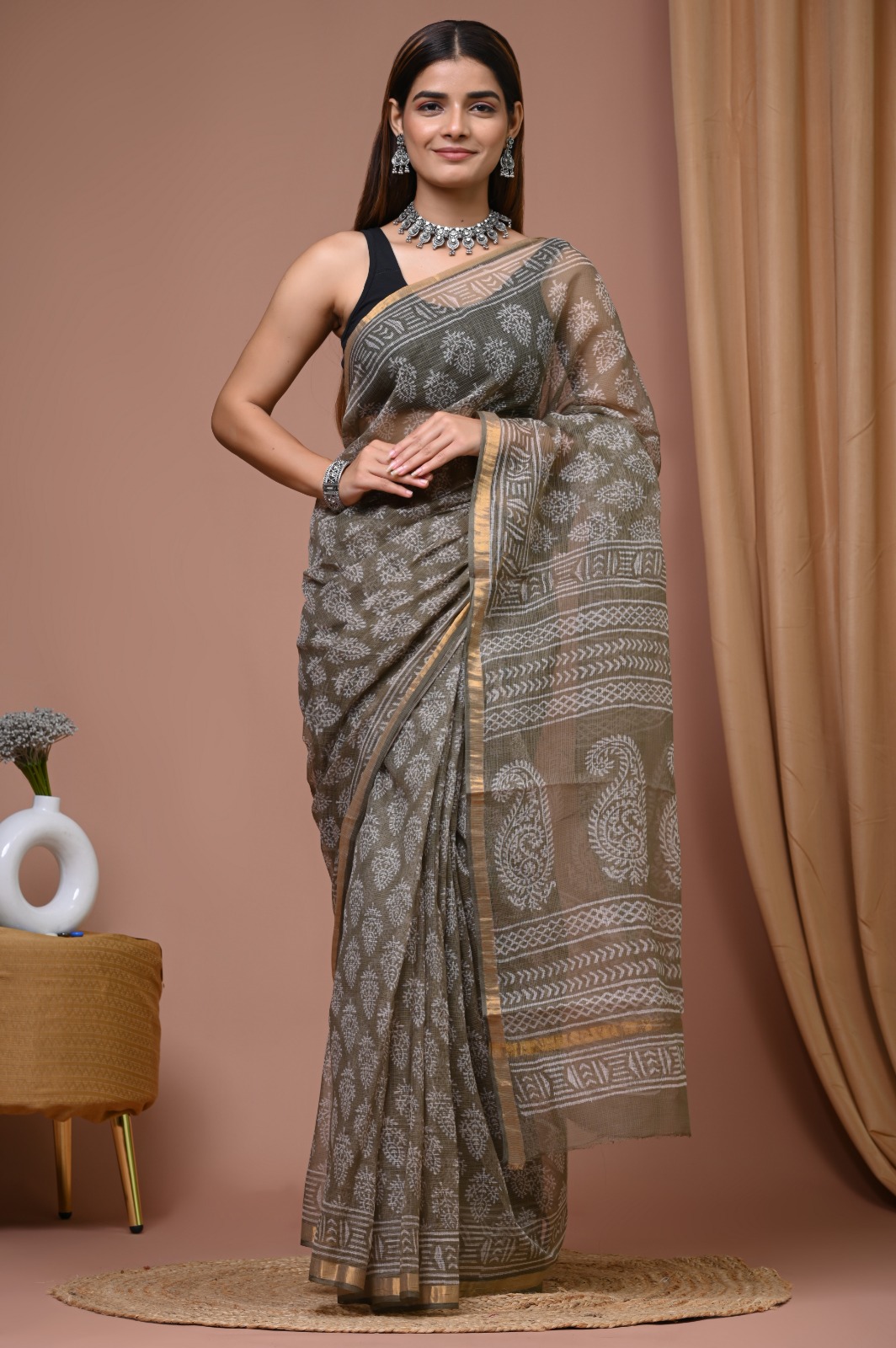 Indulge in the elegance of hand block printing with this exquisite Olive Green Kota Doria Saree from Blockart. Crafted from lightweight cotton blend fabric, this saree features intricate white floral and paisley motifs. The pallu showcases a detailed design, complemented by a thin golden border for a touch of sophistication. Ideal for casual or semi-formal occasions, this saree exudes traditional Indian craftsmanship.