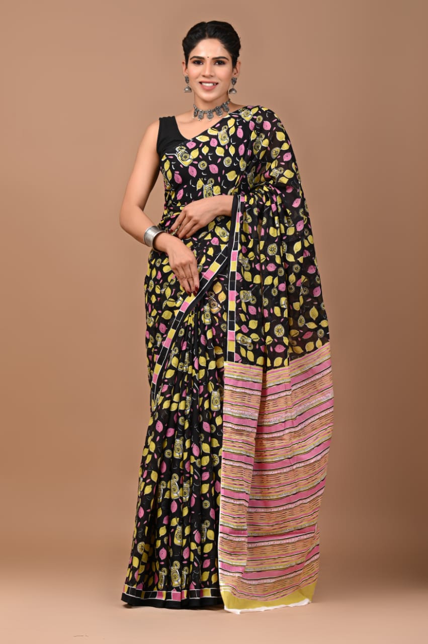 Hand Block Printed Pink and Yellow Floral Mulmul Cotton Saree