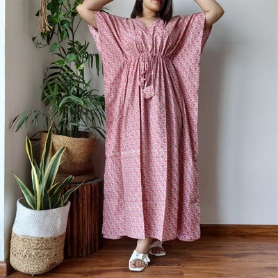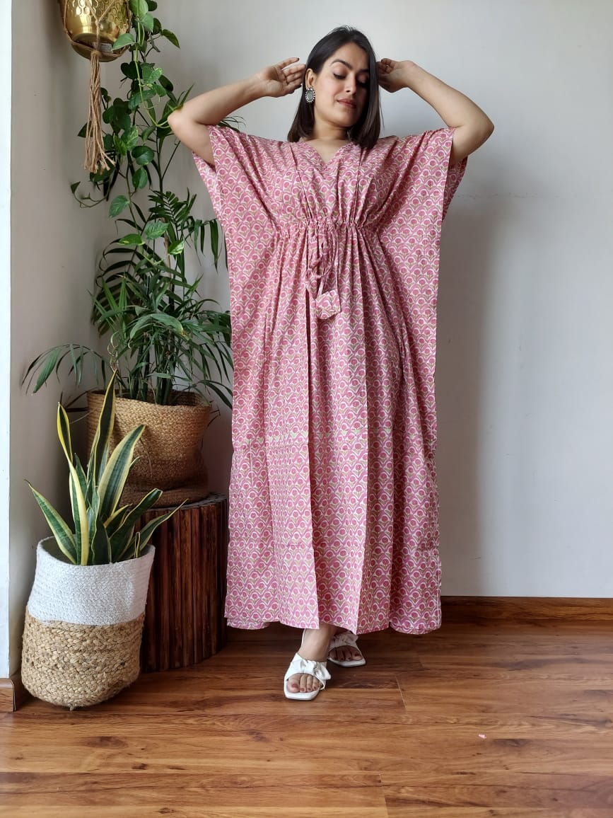 Indulge in the artistry of hand block printing with this exquisite pink cotton kaftan. Crafted from 100% pure cotton, this free-size piece features a V-neckline, wide batwing sleeves, and a cinched waist with a tassel tie for a customizable fit. The intricate repetitive pattern adds a touch of elegance to this 52-inch long, flowy garment, perfect for casual summer days or laid-back occasions.
