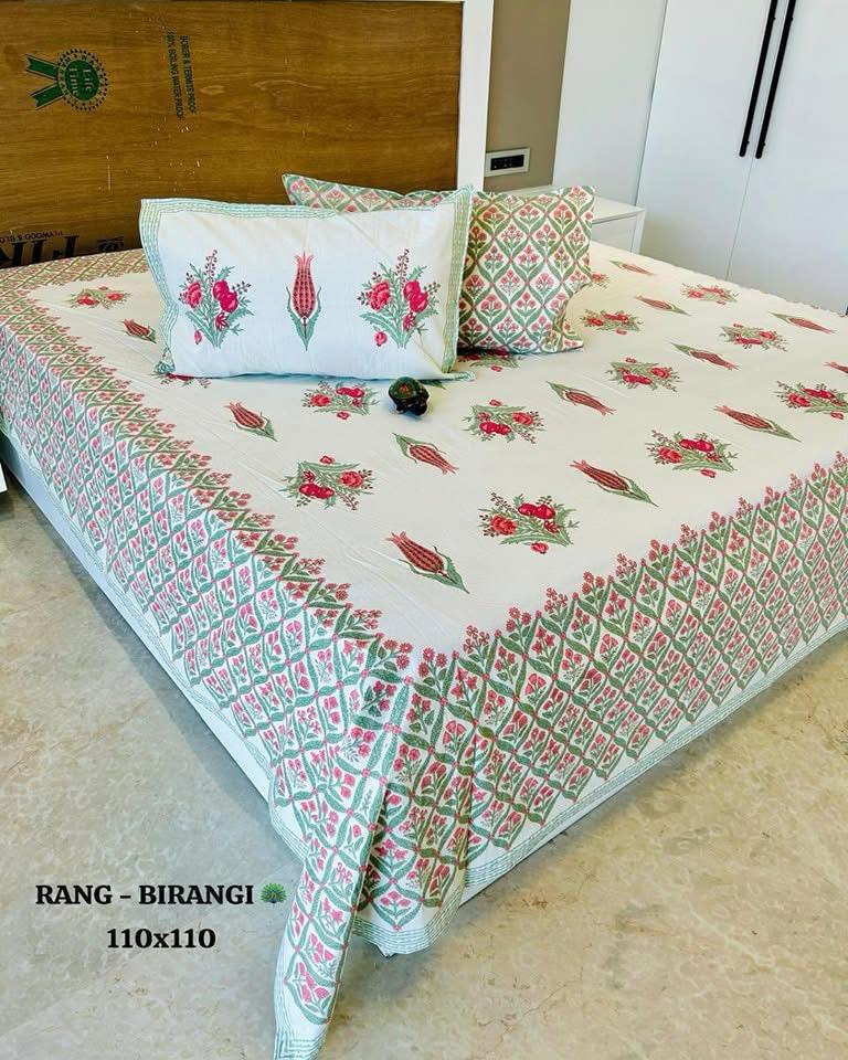 Experience the artistry of hand block printing with our exquisite Pink Floral Cotton King Bedsheet Set. Crafted with premium cotton fabric, this set includes a jumbo king-size bedsheet measuring 110x110 inches and two stitched pillow covers measuring 18x27 inches. The intricate floral pattern in shades of pink and green exudes traditional charm, making it a perfect addition to your bedroom decor. The soft and breathable cotton material ensures a comfortable night's sleep.
