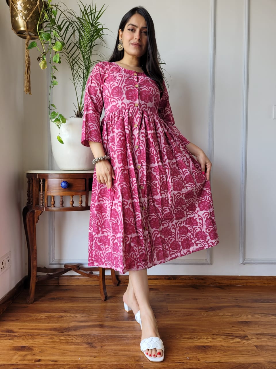 Elevate your style with our artisanal Bagru Hand Printed Pink Floral Cotton Midi Dress. Crafted from high-quality 60*60 Super Dying cotton, this dress features a round neckline, three-quarter sleeves, and a gathered skirt for a voluminous look. The button-down front adds a touch of elegance. Embrace the beauty of traditional Indian craftsmanship and experience unmatched comfort in this exquisite piece. Perfect for casual outings or special occasions.