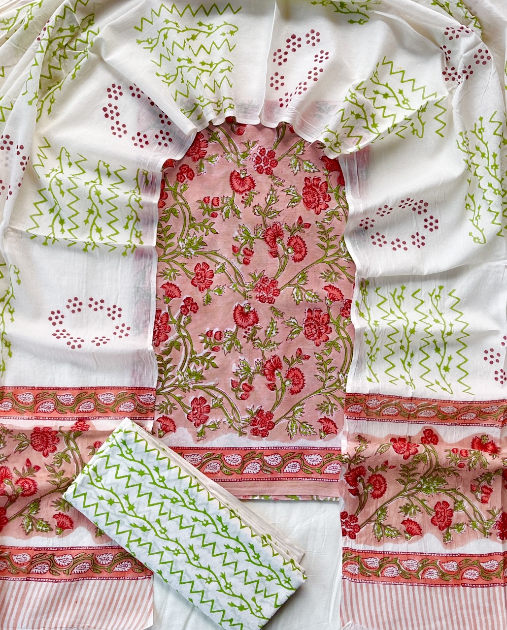Elevate your ethnic wardrobe with our exquisite Hand Block Printed Pink Floral Cotton Suit Set. Crafted with premium cotton fabric, this set features intricate floral and geometric patterns in red and green hues. The top piece showcases charming red floral prints on a light pink base, complemented by green leaves.