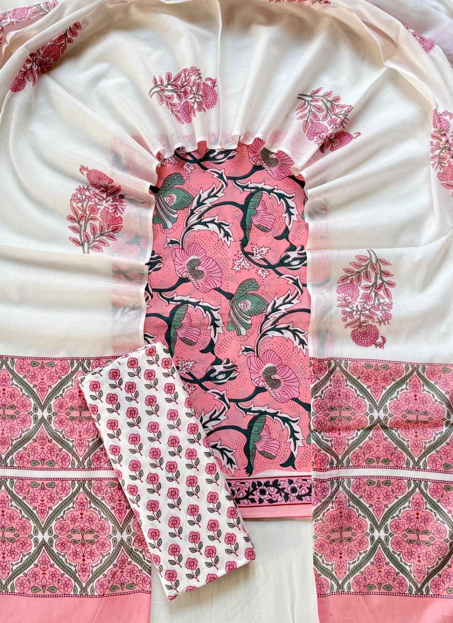 Experience the artistry of hand block printing with our exquisite cotton suit set. Crafted with precision, this set features a pink base with green and black floral patterns on the main fabric, complemented by smaller floral prints on the accompanying pieces. The lightweight and breathable cotton fabric ensures comfort all day long. Embrace tradition with this premium ensemble.