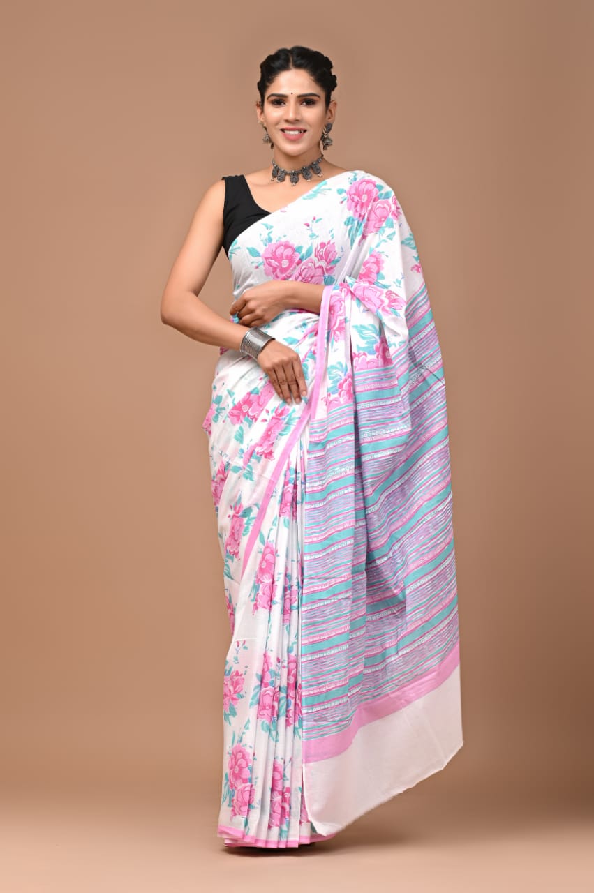 Hand Block Printed Pink Floral Mulmul Cotton Saree