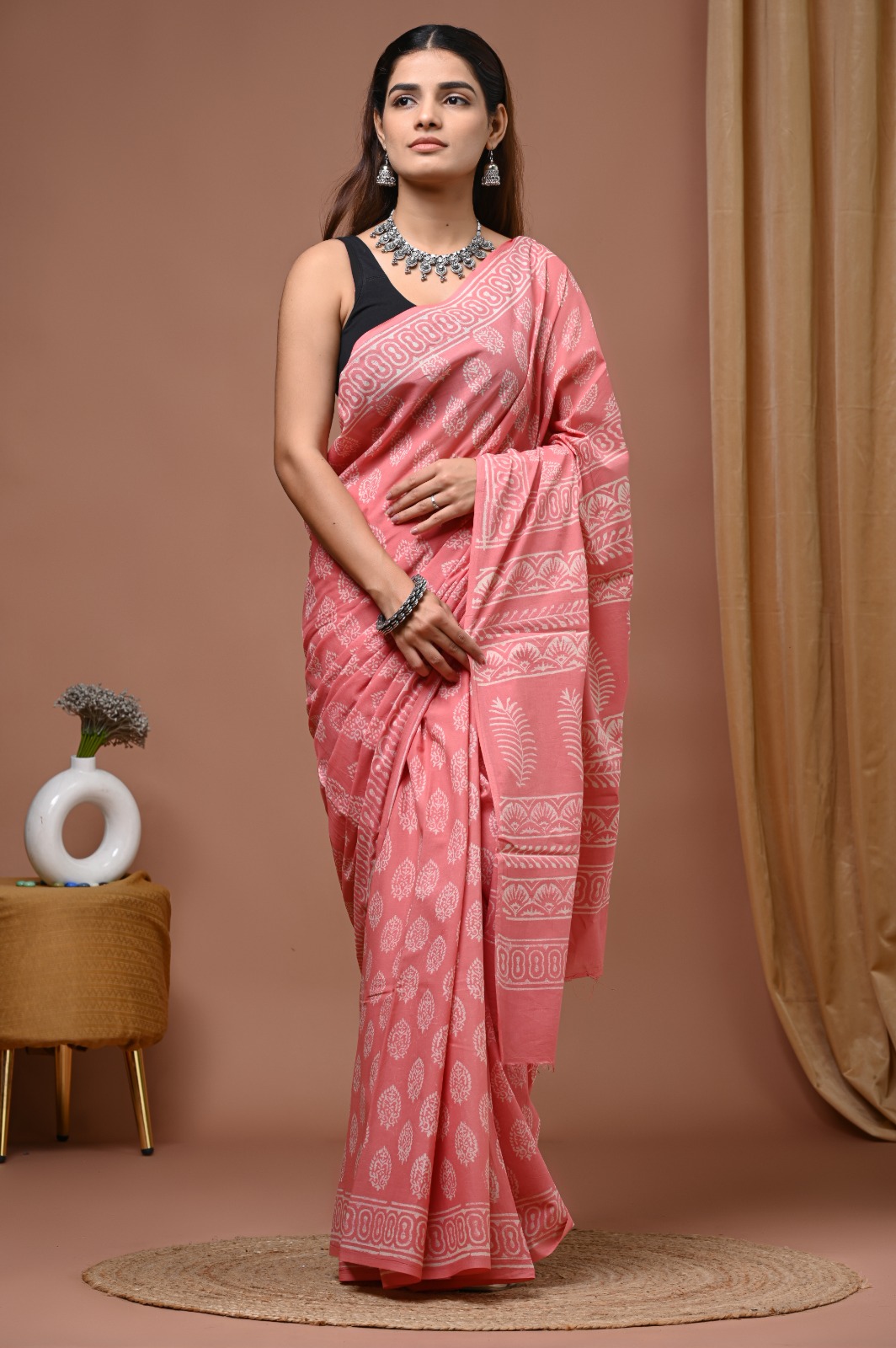 • Hand block printed mulmul cotton saree (5.5 meters)