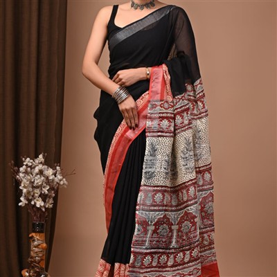 Elevate your ethnic wardrobe with this exquisite Hand Block Printed Red and Cream Cotton Saree from Blockart. Crafted in premium cotton, this saree features a plain black body adorned with a contrasting, heavily patterned pallu in red and cream. The red border and intricate hand block print designs add a touch of tradition and charm to your ensemble. Embrace the artistry and comfort of hand block printing with this elegant saree.