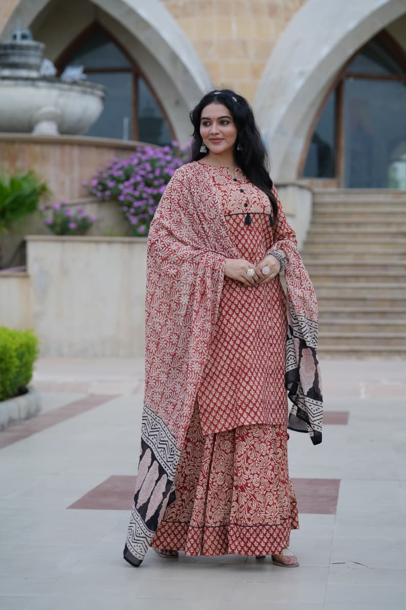 Hand Block Printed Red & Beige Cotton Ethnic Ensemble