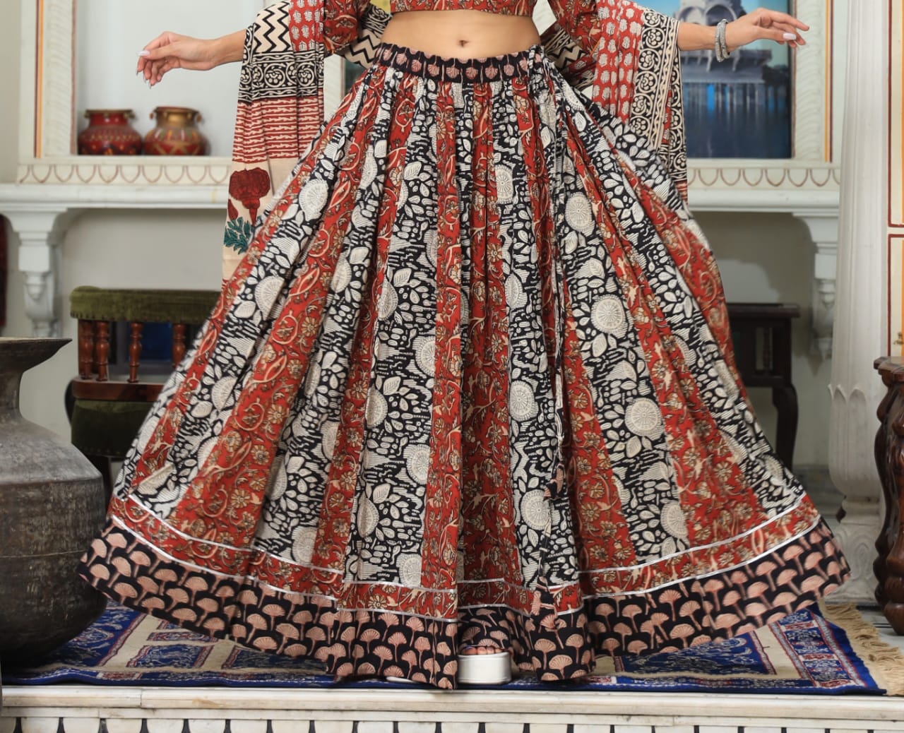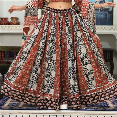 Enhance your ethnic wardrobe with our exquisite Hand Block Printed Red & Black Cotton Ethnic Skirt. Crafted from pure cotton, this traditional skirt features intricate floral and leaf motifs. The gathered waistband and multi-panel design offer a flattering silhouette with a significant flare of 5.5 meters. Pair it with the matching blouse and dupatta for a complete look. Elevate your style with this premium artisanal creation. Explore more ethnic skirts.