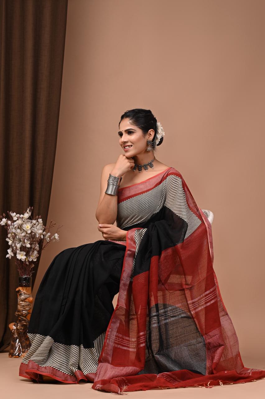 Elevate your ethnic wardrobe with this exquisite hand block printed saree from Blockart. Crafted from premium linen fabric, this saree features a striking black base with a bold red border, complemented by a cream striped blouse. The intricate checkered pattern on the pallu adds a touch of elegance, making it perfect for special occasions. The lightweight and breathable fabric ensure comfort all day long.