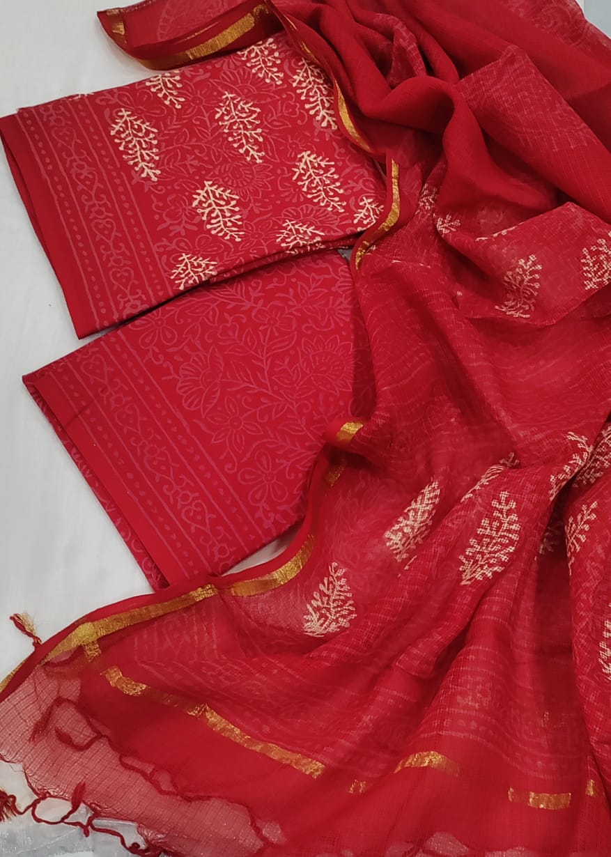 Immerse yourself in traditional Indian craftsmanship with this exquisite dress material set from Blockart. The hand block printed red cotton fabric exudes elegance, while the golden accents add a touch of luxury. The set includes fabric for the top, bottom, and dupatta, all crafted with care and attention to detail.