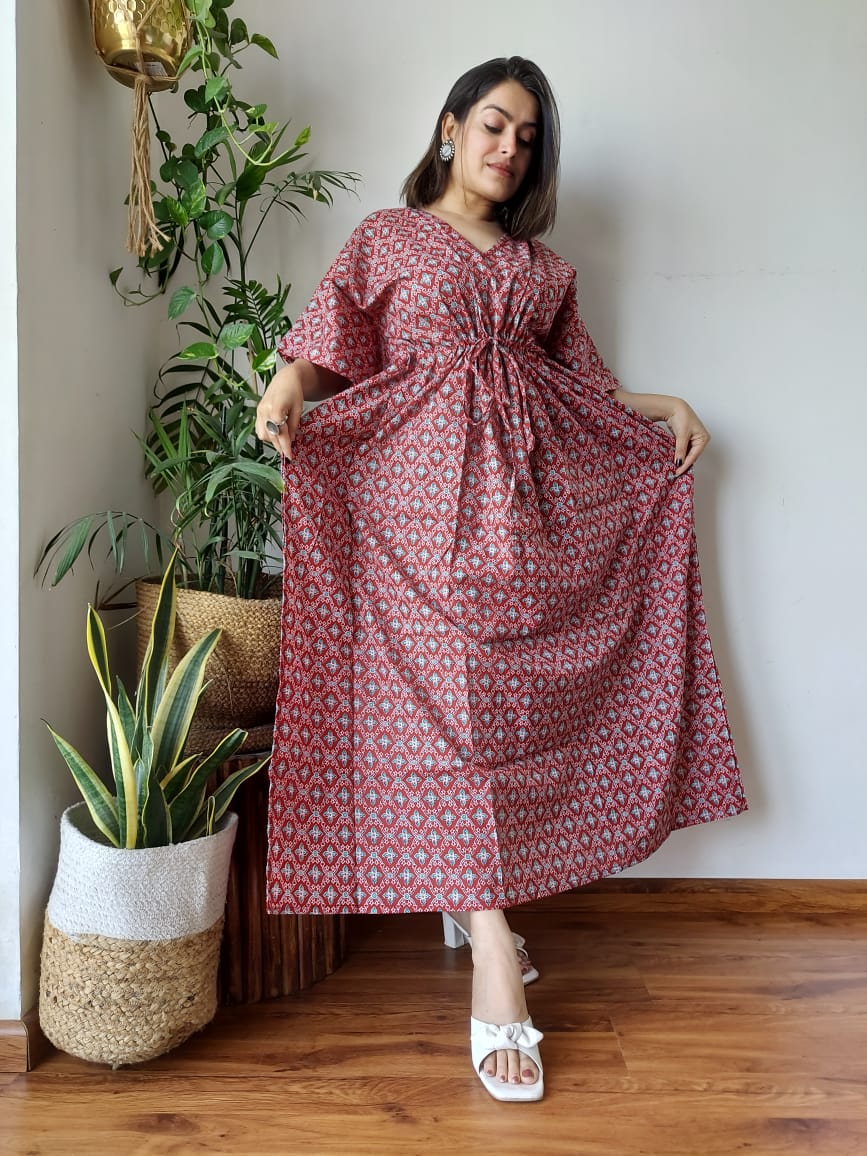 Elevate your style with this exquisite hand block printed maxi dress from Blockart. Crafted from 100% pure cotton, this dress features a V-neckline, short loose sleeves, and a flattering gathered waist detail. The flowing A-line silhouette ensures comfort and style, making it perfect for any occasion. Embrace the artisanal charm of hand block printing with this premium ethnic wear piece.