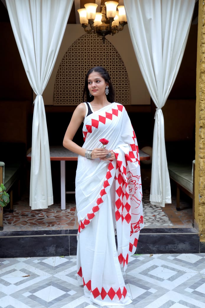 Hand Block Printed Red Diamond Cotton Mulmul Saree
