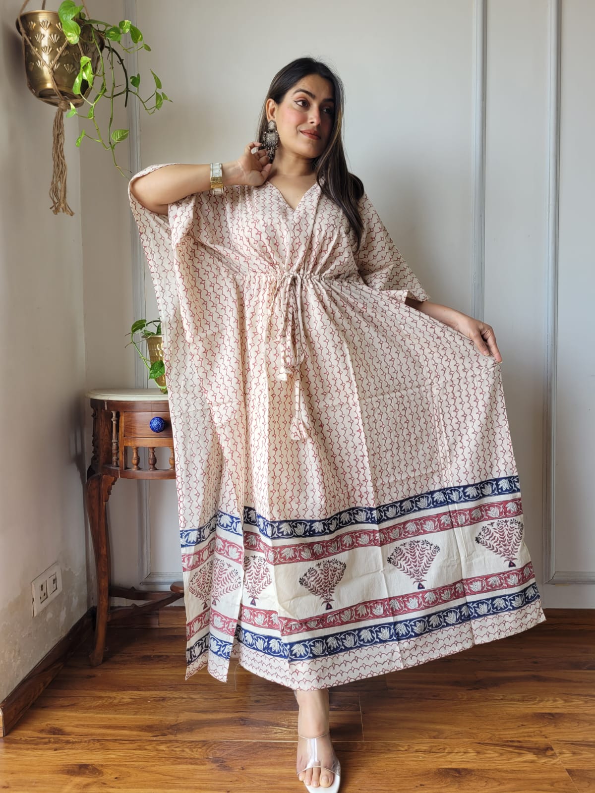 Elevate your style with our Hand Block Printed Red Floral Cotton Kaftan Dress. Crafted from 100% pure cotton, this free-size dress features a v-neckline, drawstring waist with tassels, and wide flowing sleeves. The intricate floral and leaf motifs in red and white add a touch of artisanal charm. Embrace comfort and elegance with this 52-inch long dress.