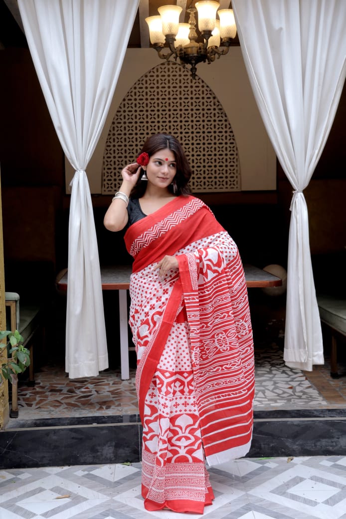 Elevate your ethnic wardrobe with our handcrafted Mulmul Cotton Saree. This exquisite saree features intricate red floral patterns, showcasing traditional Indian craftsmanship at its finest. Made from premium quality cotton, this saree offers both style and comfort, making it perfect for cultural events or festive occasions.