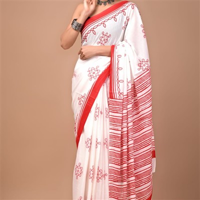 Elevate your ethnic wardrobe with this exquisite mulmul cotton saree from Blockart. Crafted with care using traditional hand block printing techniques, this saree features a stunning red striped design on a white canvas, exuding elegance and charm. The lightweight and soft fabric ensures comfort all day long, making it perfect for casual or semi-formal occasions. Embrace the artisanal beauty of Indian craftsmanship with this handcrafted piece.