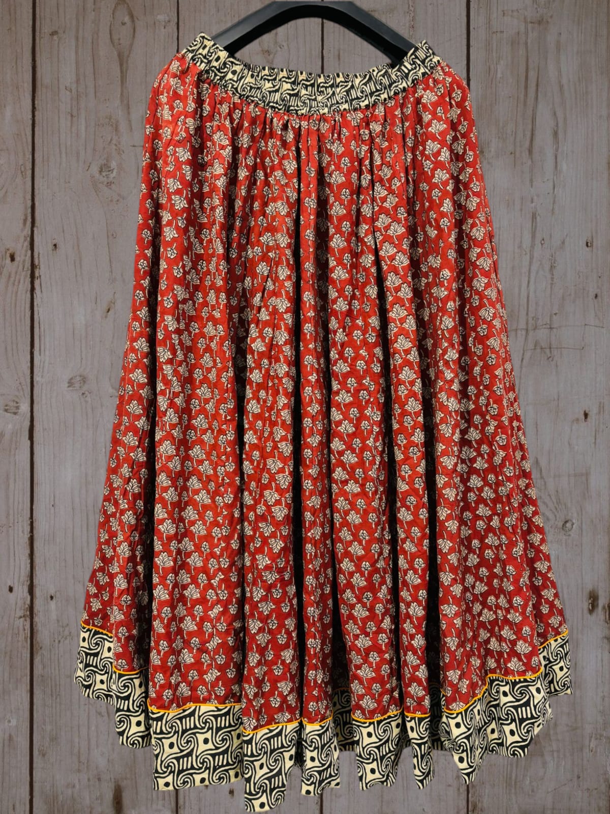 Elevate your wardrobe with our exquisite Hand Block Printed Rust Orange Skirt. Crafted from pure cotton, this ankle-length skirt features intricate floral motifs on a deep reddish-orange base, complemented by a black and cream abstract border design. The elastic waistband ensures a comfortable fit, while the 5.5 meters flare adds graceful movement. Perfect for casual or ethnic occasions.