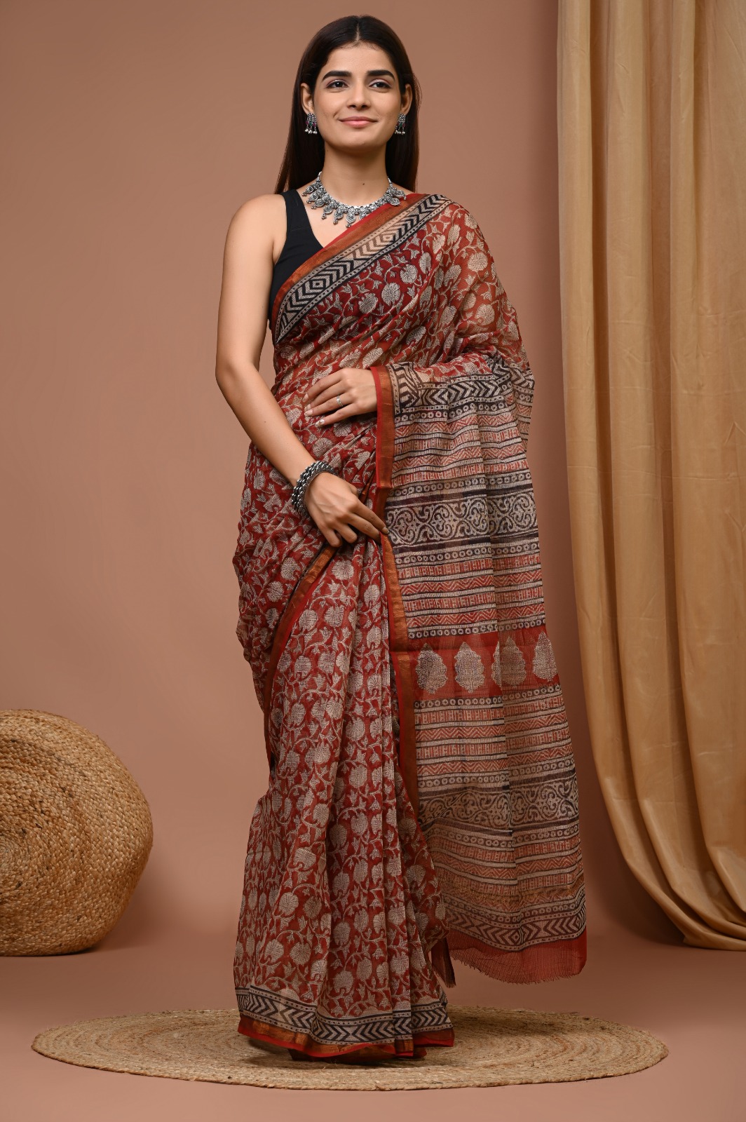 Indulge in the timeless elegance of hand block printing with this exquisite Rust Red Kota Doria Saree from Blockart. Crafted from lightweight cotton blend fabric, this saree features intricate floral and geometric patterns throughout. The distinct black and beige geometric border adds a touch of sophistication, while the pallu showcases horizontal stripes and motifs for a captivating look. The saree comes with a plain black sleeveless blouse for a complete ensemble.