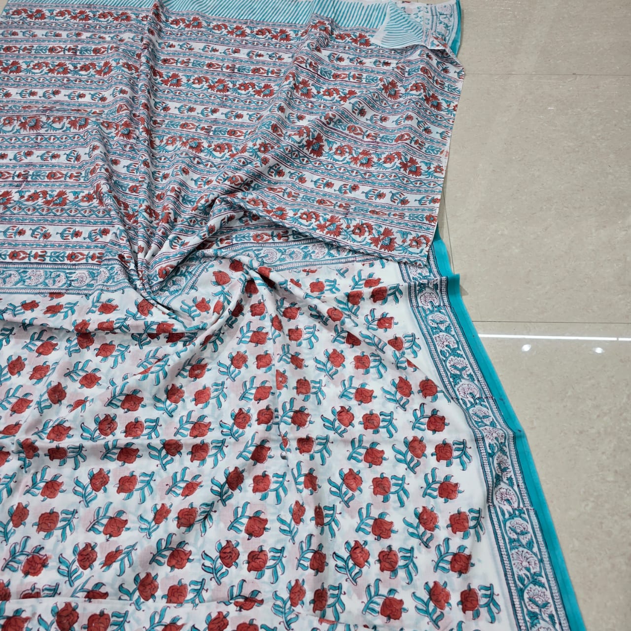Hand Block Printed Teal Floral Cotton Saree