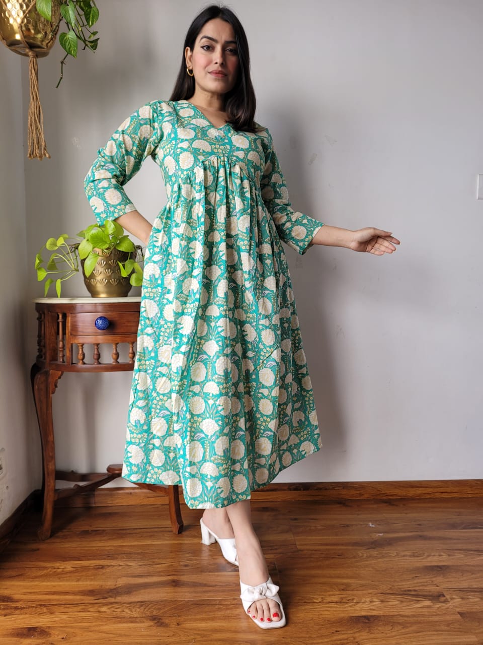 Experience the timeless beauty of hand block printing with our exquisite Teal Green Cotton Flared Dress. Crafted with precision, this dress features a charming floral pattern in white and beige, enhancing its artisanal appeal. The V-neckline and long sleeves add a touch of elegance, while the gathered skirt offers a flattering silhouette. Made from high-quality Cotton 60*60 Super Dying fabric, this dress ensures both style and comfort for any occasion.