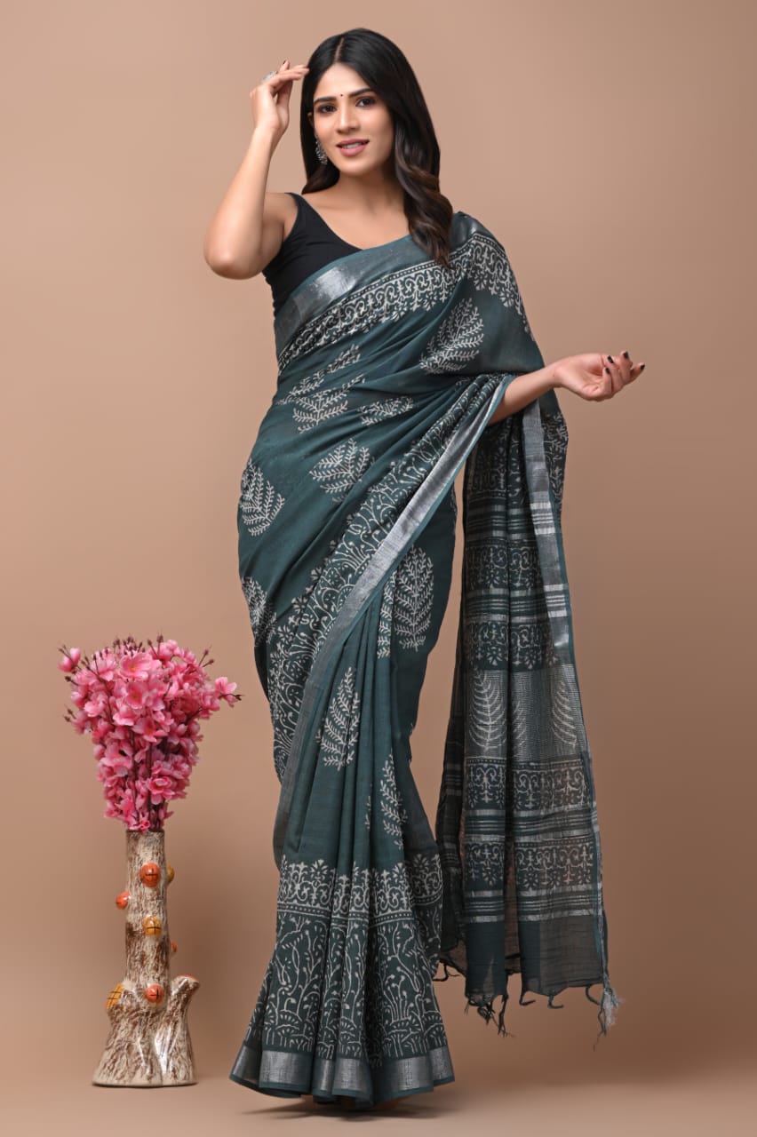 Hand Block Printed Teal Linen Saree with Silver Floral Motifs