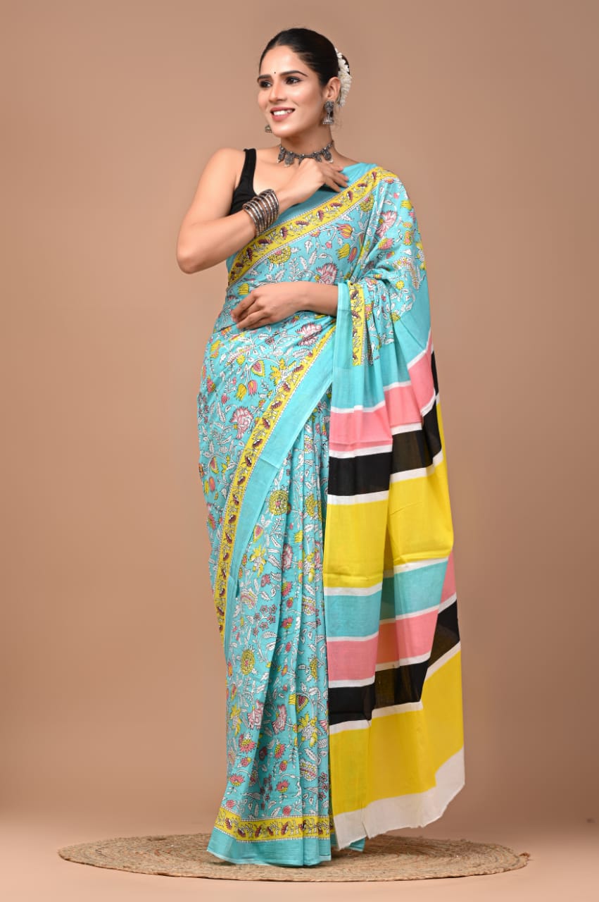 Elevate your ethnic wardrobe with our exquisite hand block printed saree crafted from premium mulmul cotton fabric. This light turquoise saree features intricate floral prints on the body and a vibrant pallu with bold colorful stripes, adding a touch of traditional charm. The detailed floral motifs on the border enhance its artisanal appeal. Perfect for casual or semi-formal occasions, this saree exudes elegance and comfort.