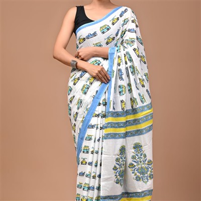 Elevate your ethnic wardrobe with our exquisite hand block printed cotton mulmul saree. Crafted with care, this saree features a whimsical vehicle motif in shades of blue, yellow, green, and black, creating a playful yet traditional look. The lightweight fabric ensures comfort, making it perfect for casual or semi-formal occasions. The pallu showcases additional decorative elements with horizontal stripes and floral motifs in blue and yellow, adding a touch of elegance.