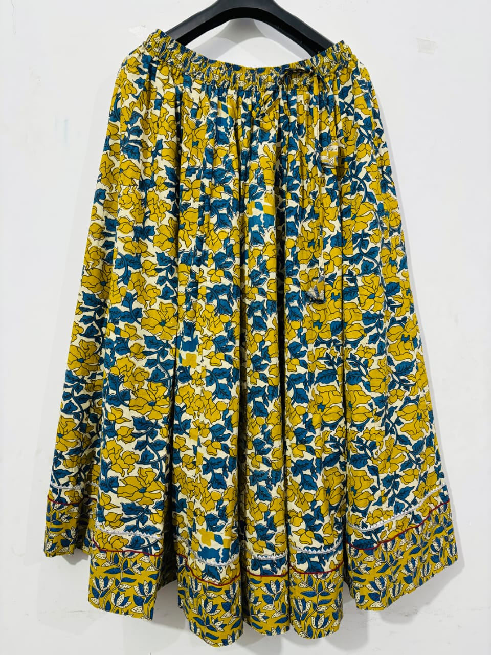 Hand Block Printed Yellow and Blue Cotton Floral Skirt