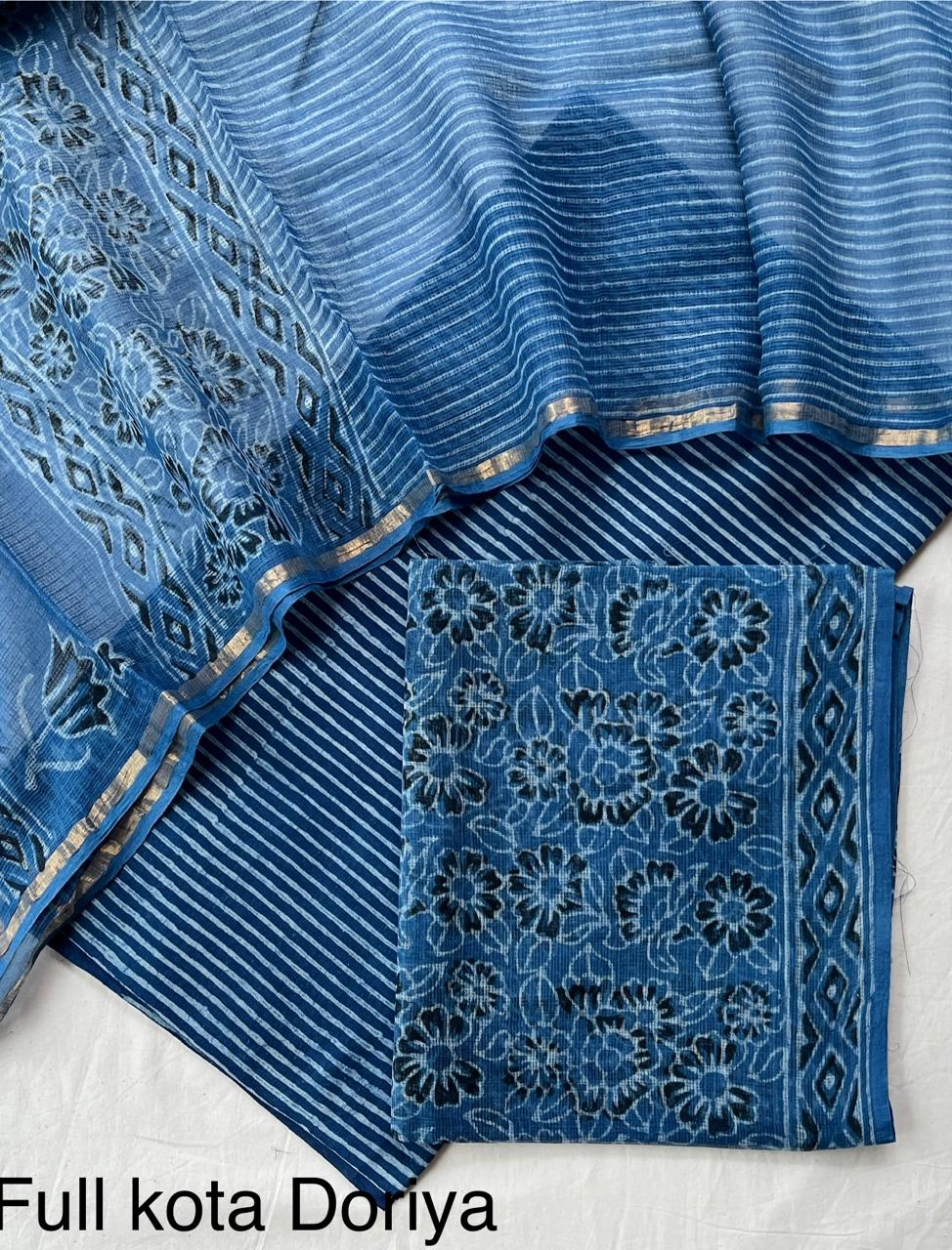 Experience the timeless charm of traditional Indian craftsmanship with this exquisite suit set. Crafted from pure Kota Doria, known for its distinctive square-check weave (khats) that provides a unique blend of transparency and strength, this fabric ensures a lightweight and breathable feel, perfect for warmer climates. The suit features floral handblock prints, meticulously applied by skilled artisans using wooden blocks. These delicate patterns depict various blossoms, often in soft, harmonious colors, creating an elegant and feminine aesthetic. The handblock technique ensures each piece is unique, showcasing minor irregularities that add to its authentic beauty. Ideal for semi-formal occasions or elegant daily wear, offering both comfort and sophisticated style.