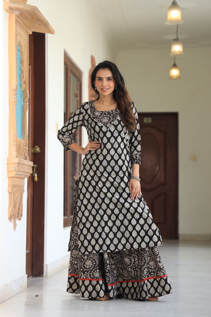 Indulge in the exquisite art of hand block printing with this premium cotton kurta and skirt set. The kurta features a beige leaf motif on a black base, adorned with detailed embroidery around the neckline and three-quarter sleeves. The matching skirt boasts a floral and leaf pattern in beige with a contrasting red border, exuding traditional elegance. Crafted for comfort and style, this set is perfect for casual or semi-formal ethnic occasions.