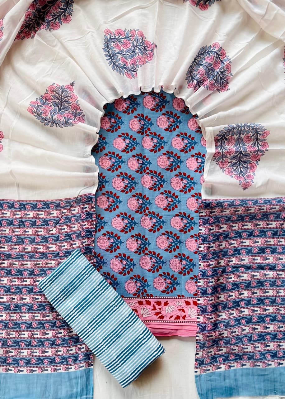 Elevate your ethnic wardrobe with this exquisite handcrafted Blue Floral Cotton Suit Set. Made from premium lightweight cotton, this set features intricate hand block prints in blue, pink, and red. The top and bottom fabrics are perfect for creating a traditional outfit, while the coordinating dupatta adds a touch of elegance. Embrace the comfort and artistry of Indian craftsmanship with this set. Explore more unstitched suit options