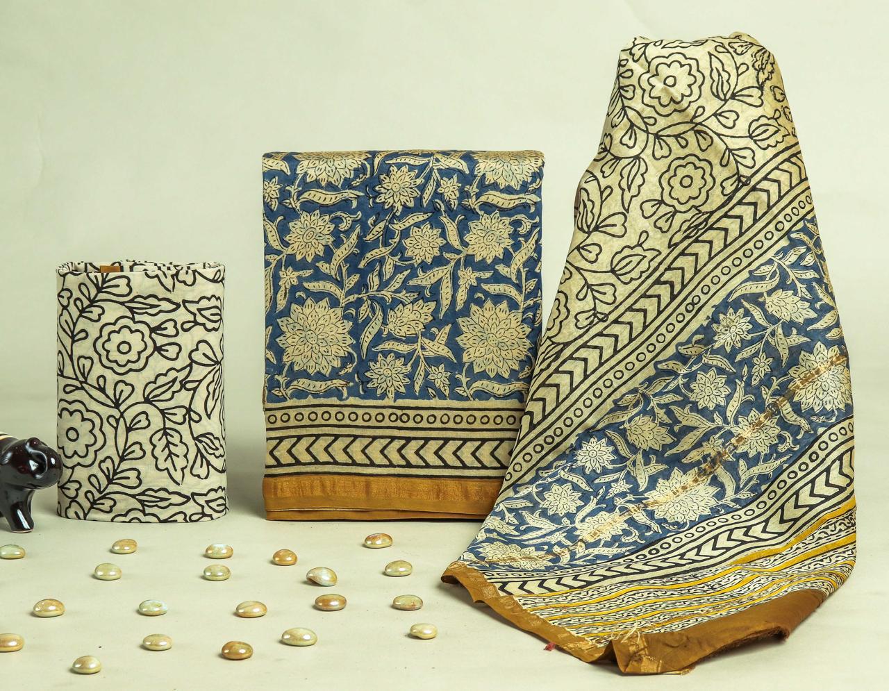 Elevate your wardrobe with this hand block printed Chanderi silk dress material set from Blockart. Crafted with precision and care, each piece showcases intricate floral and leaf motifs, reflecting true Indian craftsmanship. The top features soft Chanderi silk, known for its elegance and drape, while the bottom and dupatta offer comfort in premium cotton fabrics. Embrace the artistry of traditional block printing with this set, perfect for creating unique ethnic wear.