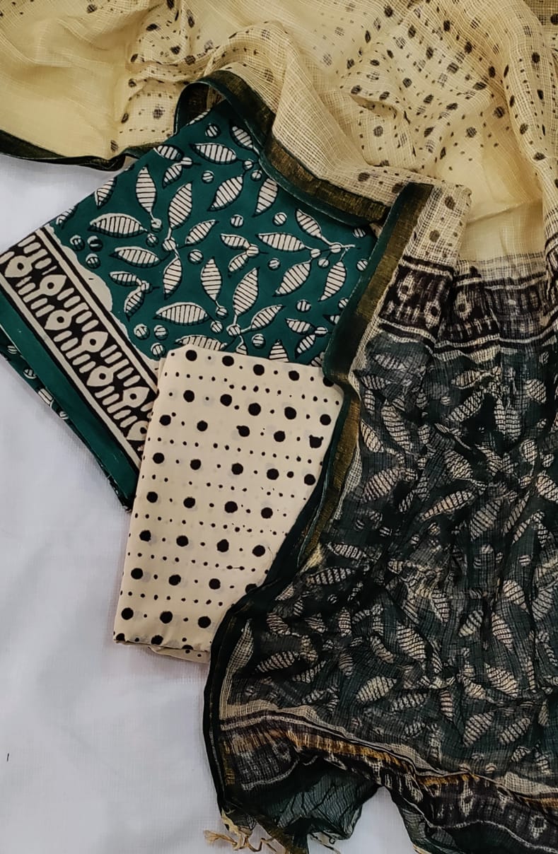 Elevate your ethnic wardrobe with this exquisite handcrafted cotton suit set from Blockart. Each piece is hand block printed, showcasing intricate leaf patterns and polka dots, reflecting true craftsmanship. Made from high-quality, lightweight cotton fabric, this set offers comfort and style. The dupatta features a charming spotted design with a crinkled texture, adding a touch of elegance to your ensemble.