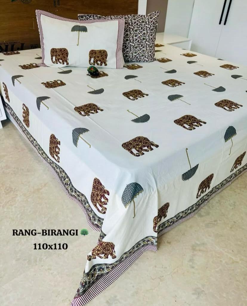 Enhance your bedroom with this exquisite hand block printed cotton bedsheet set. The white base is adorned with charming brown elephants and grey umbrellas, exuding traditional Indian craftsmanship. The intricate floral and striped border adds a touch of elegance. Made with premium quality cotton, this set includes a jumbo king size bedsheet and two pillow covers, each meticulously handcrafted for comfort and style. Elevate your home decor with this artisanal masterpiece.