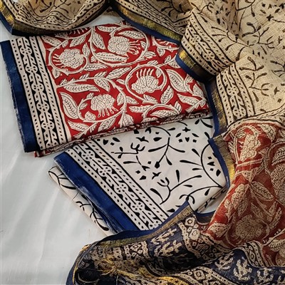 Experience the elegance of traditional Indian craftsmanship with this handcrafted cotton suit set. The intricate floral and leaf patterns, meticulously block printed on lightweight cotton fabric, exude a sense of authenticity and charm. The set includes a top, bottom, and a Kota Doria dupatta, all designed to offer comfort and style. Embrace the beauty of artisanal textiles with this exquisite ensemble.