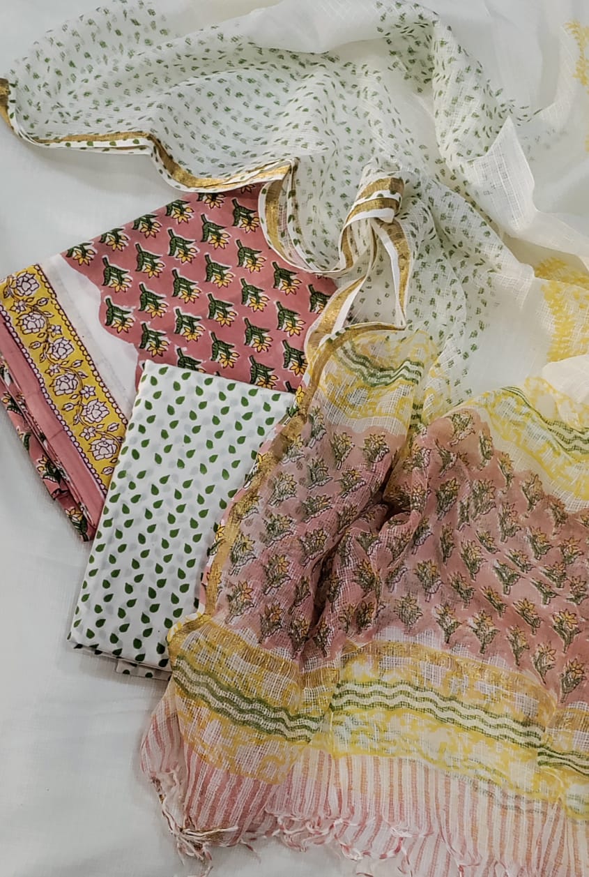 Experience the elegance of traditional Indian craftsmanship with this hand block printed cotton suit set. The set includes 2.5 meters each of cotton fabric for the top and bottom, along with a stunning Kota Doria dupatta. The floral and leaf motifs add a touch of nature-inspired beauty to the attire, making it perfect for ethnic occasions.