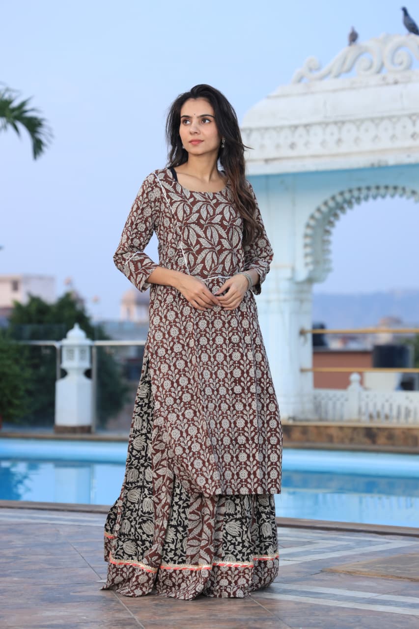 Elevate your style with this exquisite hand block printed kurta and skirt set from Blockart. Made from premium cotton, this set features a beautiful ivory floral pattern on the kurta and a contrasting black skirt with intricate motifs. The kurta boasts a round neckline, three-quarter sleeves, and side slits for a graceful look. Perfect for casual or semi-formal occasions, this ensemble combines comfort with traditional craftsmanship.