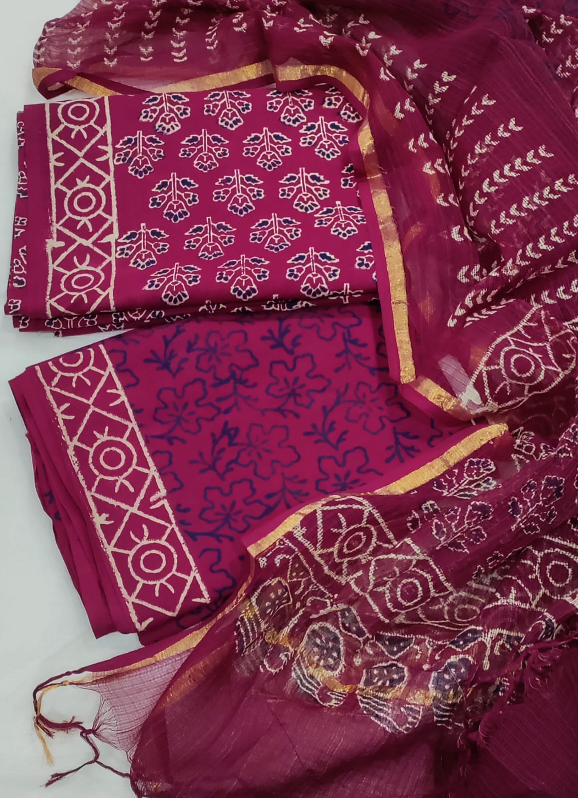 Elevate your ethnic wardrobe with this exquisite handcrafted cotton suit set from Blockart. The set includes a 2.5-meter top and bottom made of premium cotton, adorned with intricate floral and geometric patterns in white and blue on a rich magenta base. The Kota Doria dupatta, measuring 2.5 meters, features a golden border and intricate motifs in white and gold. Experience the comfort of fine cotton fabric, expertly hand block printed by skilled artisans, showcasing the beauty of Indian craftsmanship.