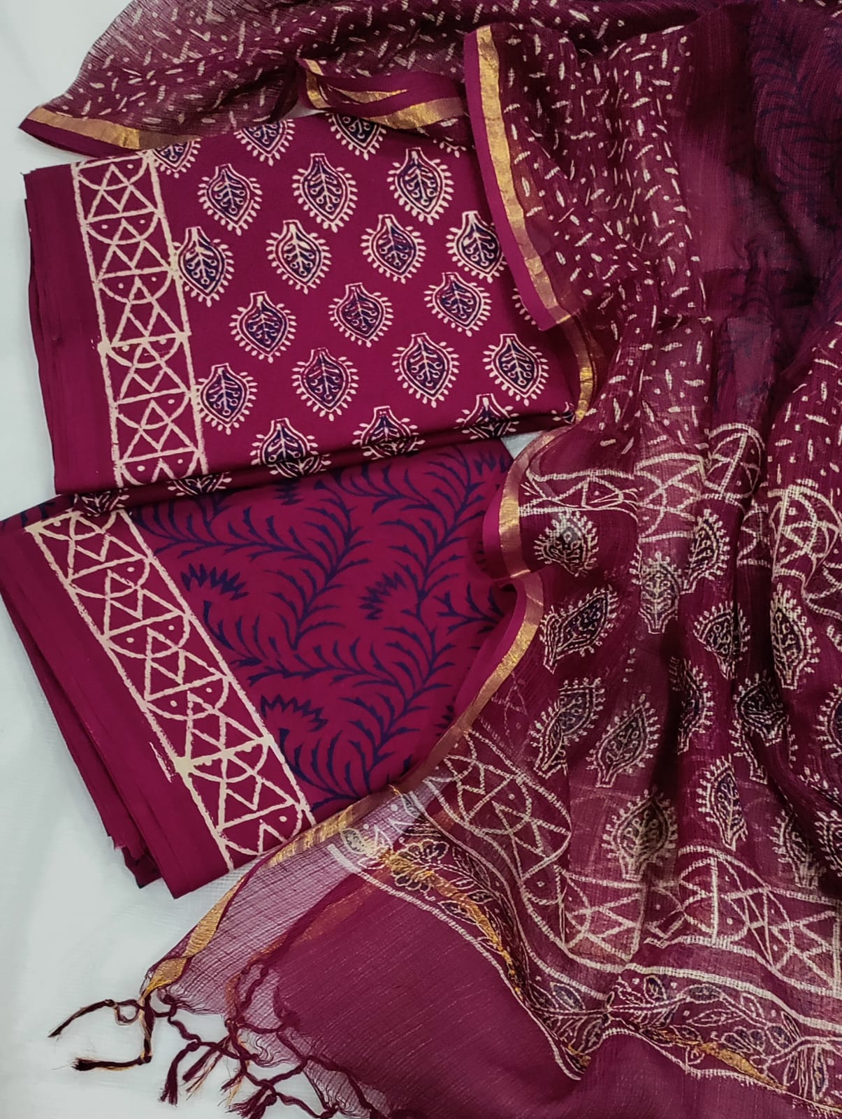Elevate your ethnic wardrobe with this handcrafted maroon cotton suit set. The top features a mesmerizing leaf motif with geometric designs, while the bottom showcases an abstract leafy pattern. The Kota Doria dupatta complements the set beautifully with matching motifs and a golden trim. Hand block printing adds a touch of tradition and craftsmanship to this ensemble, ensuring a unique and premium quality. Made from fine cotton fabrics, this set offers both style and comfort, perfect for any festive occasion.