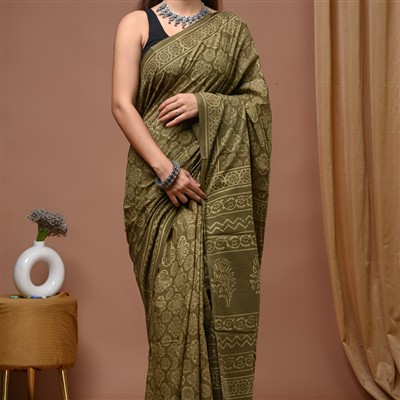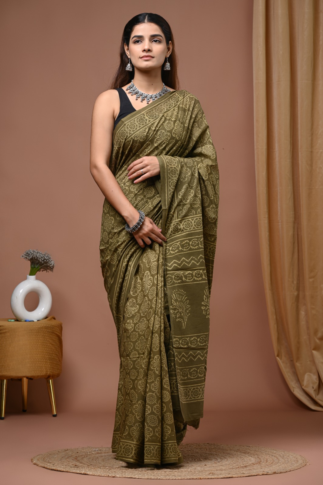 Indulge in the timeless artistry of hand block printing with this exquisite Olive Green Floral Mulmul Cotton Saree from Blockart. Crafted from premium mulmul cotton, this saree features intricate floral and geometric patterns, showcasing the rich heritage of Indian craftsmanship. The 5.5-meter length and super-dying quality ensure a luxurious drape and comfort. The saree comes with a matching blouse piece for a complete ensemble. Elevate your ethnic wardrobe with this artisanal piece.